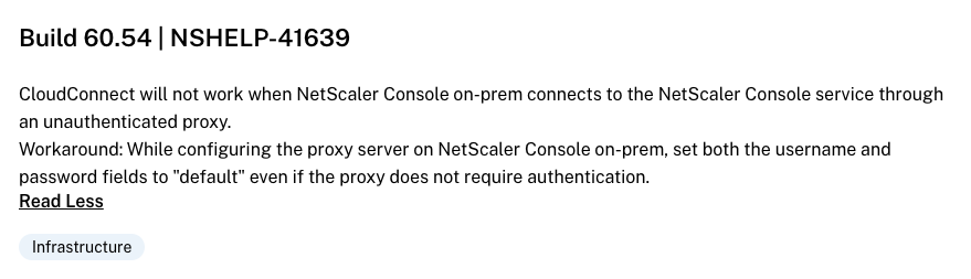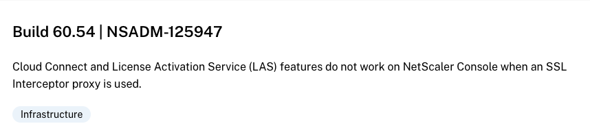 NSHELP-41158 – LAS license retrieval fails in NetScaler Console on-prem when using a proxy with Cloud Connect to connect to NetScaler Console service.