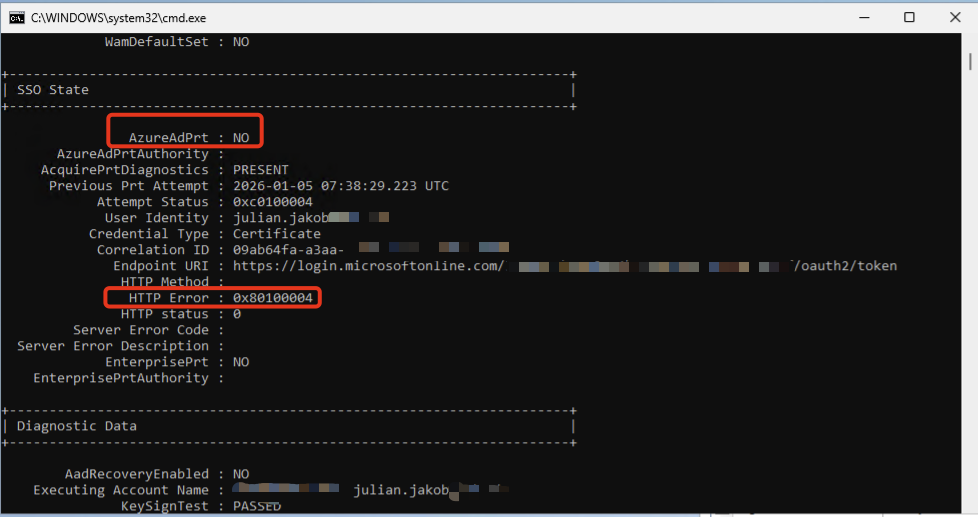 That’s why there’s the HTTP Error 0x80100004, saying the Cert isn’t supported by Entra ID CBA. CBA fails and no PRT is issued.